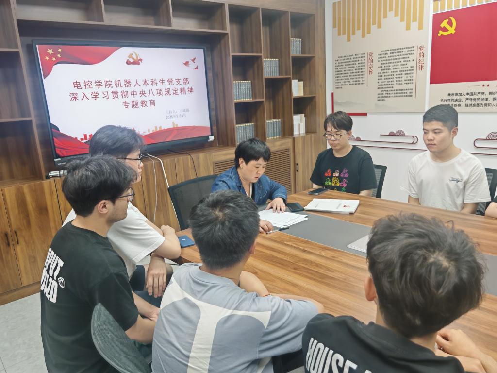 为提高全体党员的政治素养,强化作风建设,一体推进党风廉政建设,进一步深化全面从严治党,米兰milan官方网站机器人本科生党支部于2025年5月6日在明德园智通大厦327开展深入贯彻中央八项规定精神学习教育。米兰milan官方网站机器人本科生党支部书记王斌娟及支部全体党员参加会议。