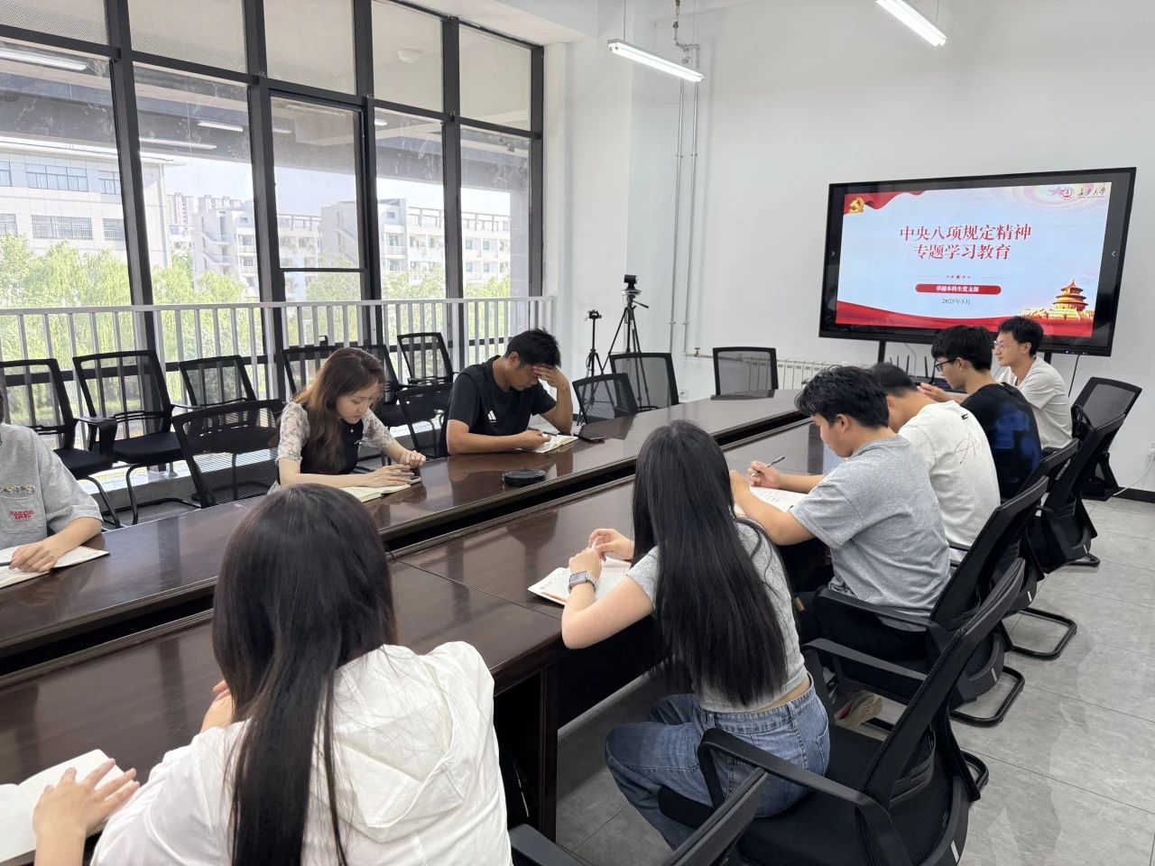 5月12日,米兰milan官方网站卓越本科生党支部于学院319会议室开展深入贯彻中央八项规定精神学习教育,党支部书记张馨月、党支部副书记刘平利及全体学生党员参会。