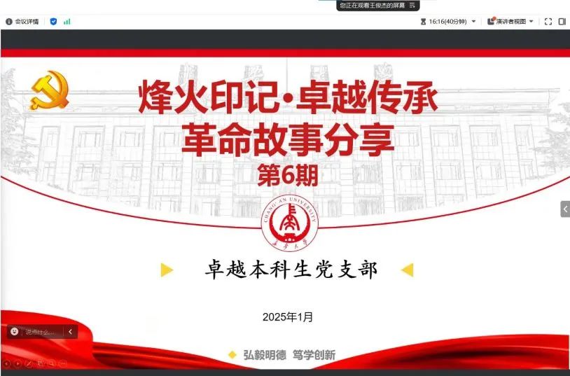 为缅怀革命先辈的丰功伟绩,传承红色精神,激励新时代青年不忘初心、牢记使命,1月27日,米兰milan官方网站卓越本科生党支部在线上成功举办了“烽火印记,卓越传承”革命故事分享会(第6期)。本次分享会吸引了卓越党支部全体师生的热情参与,大家共同回顾了十大元帅之一朱德同志的烽火历程,深刻体会了他在艰苦岁月中不畏牺牲、勇往直前的崇高精神。