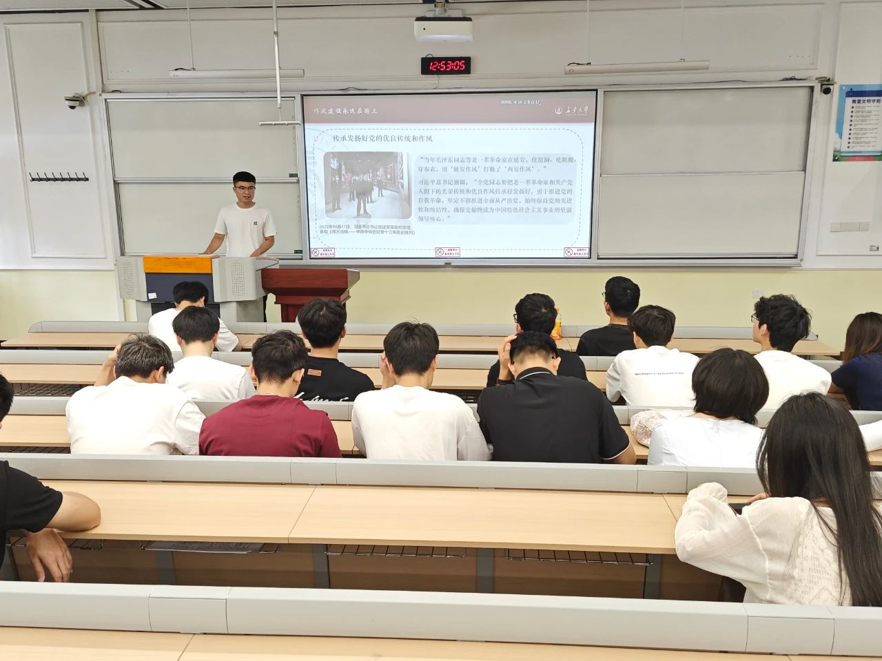 为深入学习贯彻中央八项规定精神,强化党员纪律意识,米兰milan官方网站2024级研究生第一党支部于2025年5月30日在南校区北院B171教室开展第3期“智控先锋,薪火相传”党史讲堂系列活动。活动由党支部书记张兴浩主讲,支部全体党员参加。