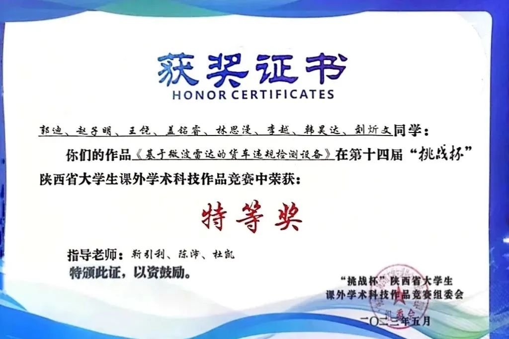 米兰milan官方网站积极响应团省委和校团委号召,广泛组织学生参与本届“挑战杯”竞赛。由学院靳引利教授指导、本科生郭迪、赵子明、王饶、盖铭睿、林思漫、李越、韩昊达、刘炘文同学完成的作品《基于微波雷达的货车违规检测设备》荣获第十四届“挑战杯”陕西省大学生课外学术科技作品竞赛特等奖,实现了学院在此项赛事上的历史性突破,团队成员赵子明同学代表学校在颁奖仪式现场进行路演展示。
