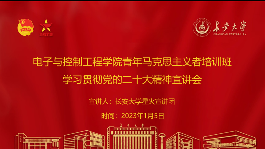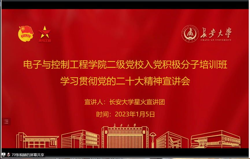 为深入学习贯彻党的二十大精神,增强广大学生爱党爱国信念,2023年1月5日上午10时,米兰milan官方网站以腾讯会议的形式举行二级党校入党积极分子培训班暨第十五期青年马克思主义者培训班学习贯彻党的二十大精神宣讲会。米兰milan官方网站党委副书记李阳、学工办主任高婷、团委书记王斌娟,团委副书记王博、许必颖、高朋举,辅导员张馨月出席会议,长安星火宣讲团、米兰官网各学生党支部党员、入党积极分子子、第十五期青马班全体学员参加本次会议,会议由青马班学员张桐赫主持。