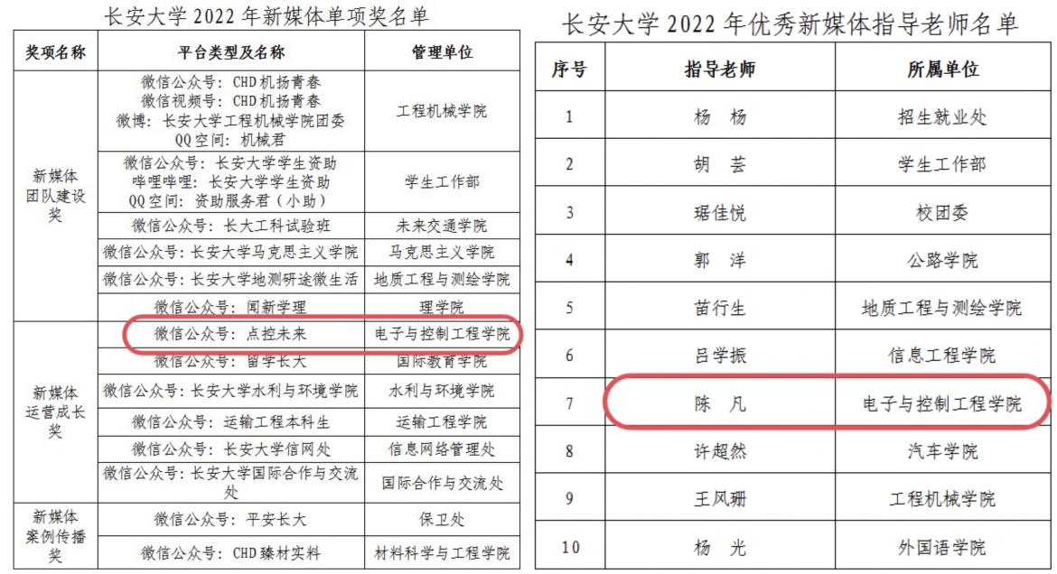 近日,学校党委发布《关于表彰米兰milan官方网站2022年优秀校园新媒体平台及优秀新媒体指导老师的决定》(长大党宣〔2023〕9号),米兰milan官方网站“点控未来”微信公众号荣获“新媒体运营成长奖”,辅导员陈凡荣获“优秀新媒体指导老师”
