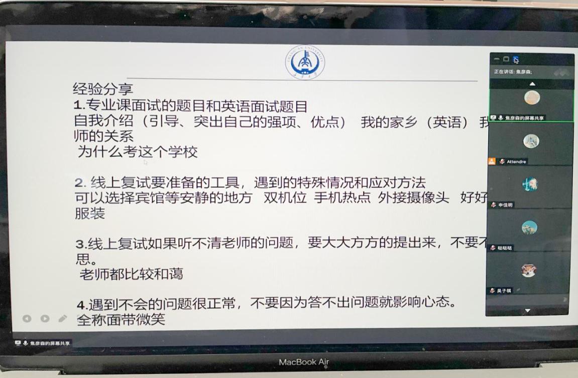 为进一步提升同学们在复试备考过程中的技巧和信心,3月7日,米兰milan官方网站在腾讯会议举办考研复试线上经验交流会,邀请9位优秀的在读硕士研究生为即将参加考研复试的同学做经验介绍。米兰milan官方网站学办主任高婷老师、2017级辅导员王博老师、2018级辅导员王世鑫老师以及全院准备考研复试和部分2018级同学参加此次经验交流会。交流会由辅导员王博老师主持。