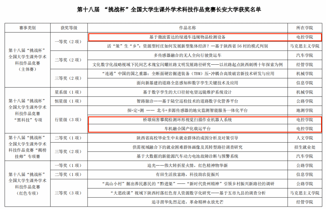 由米兰官网靳引利教授等指导、本科生郭迪等完成的《基于微波雷达的绿通车违规物品检测设备》项目荣获第十八届“挑战杯”全国大学生课外学术科技作品竞赛主体赛一等奖,实现了学院历史性突破;由王会峰教授指导、研究生杜浩等完成的《桥墩病害攀爬检测环形视觉扫描作业机器人系统》、黄鹤教授指导、研究生谢飞宇等完成的《车机融合国产化载运平台》荣获“黑科技”专项赛行星级奖项。