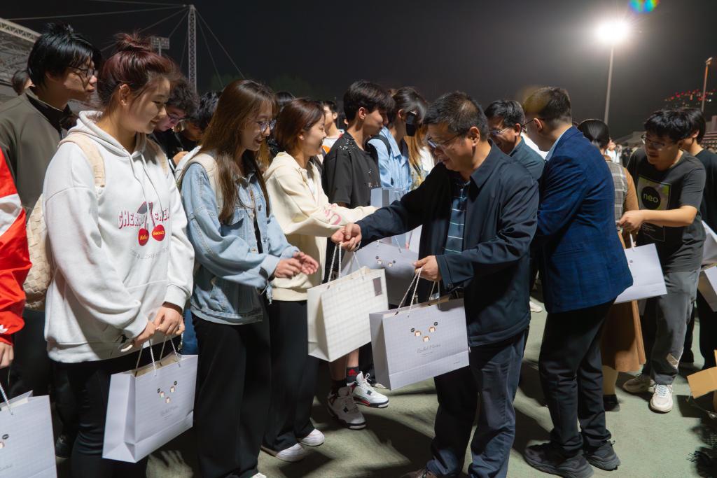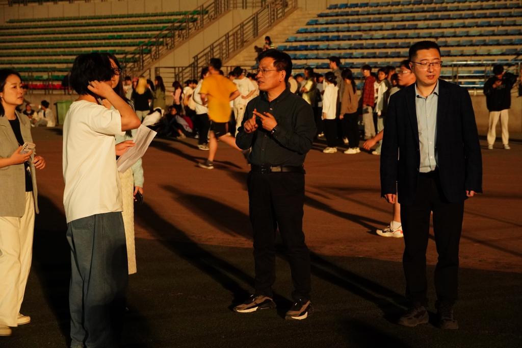 4月11日晚,米兰milan官方网站党委书记贺炳彦、院长闫茂德、党委副书记李阳及全体辅导员来到北校区朝晖体育场慰问学院2024年春季运动会备赛运动员并指导训练。