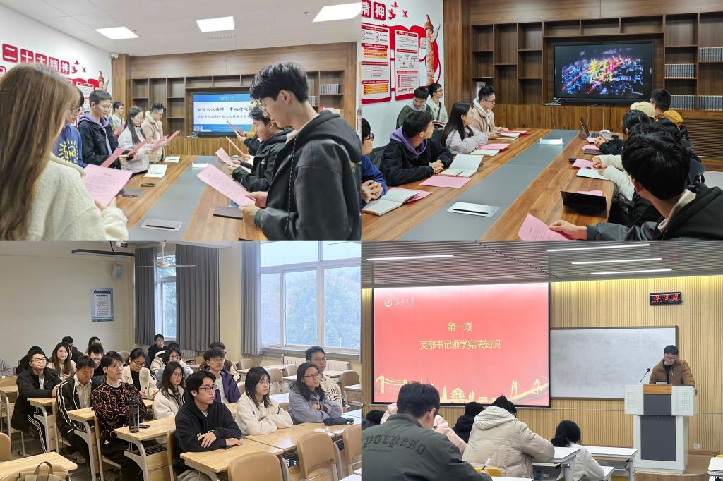 学院党委高度重视,将法治宣传教育有机融入党建工作。各本科生党支部开展“学习宪法 牢记使命”主题党日活动,教育引导学生党员厚植爱国情怀,弘扬宪法精神,以奋发有为的姿态投身中国式现代化建设;各研究生党支部开展“遵宪法 学宪法 讲宪法”主题党日活动,支部书记围绕宪法的概念、本质、历史发展和指导思想等方面进行深入细致的剖析及重点解读;卓越本科生党支部开展“晨读宪法 铭记于心”主题党日活动,通过主题故事分享和宪法朗读,进一步加深对宪法的理解,体会宪法温度,感受宪法力量。